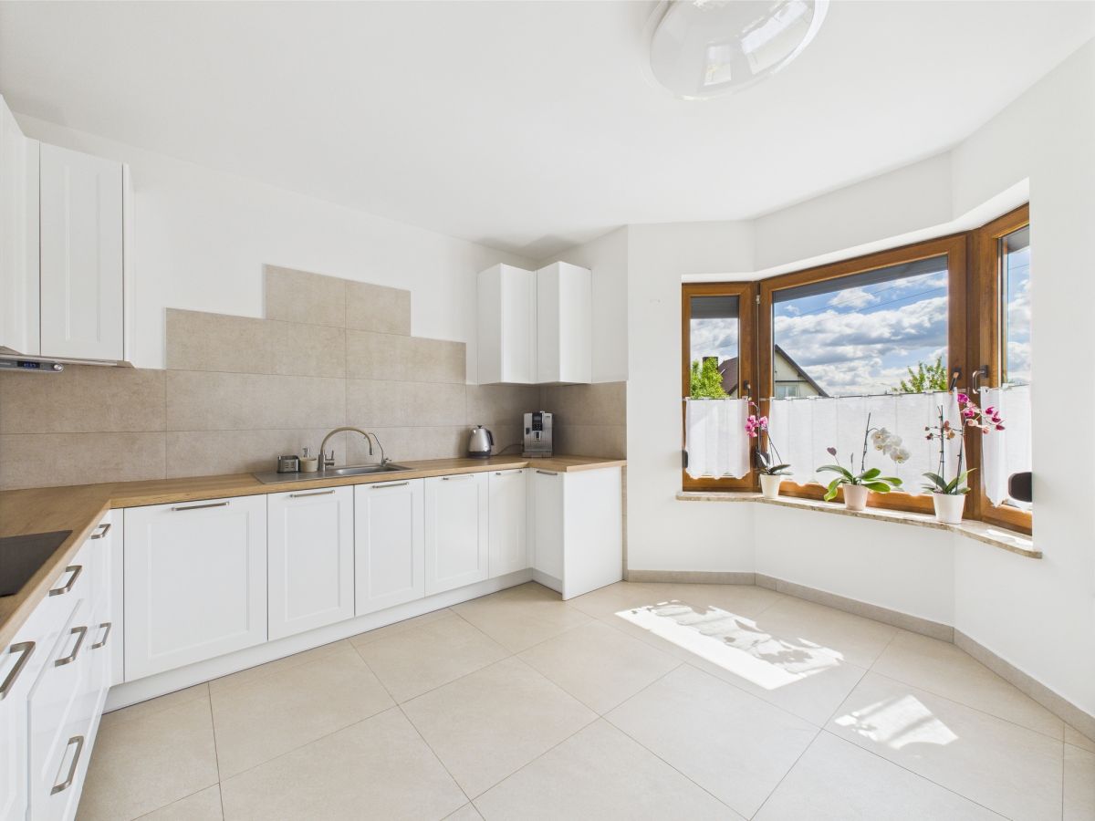 - KUCHNIA z wykuszem na kącik jadalniany ( ok 15 m²), wyposażona w zabudowę meblową z niezbędnymi sprzętami AGD