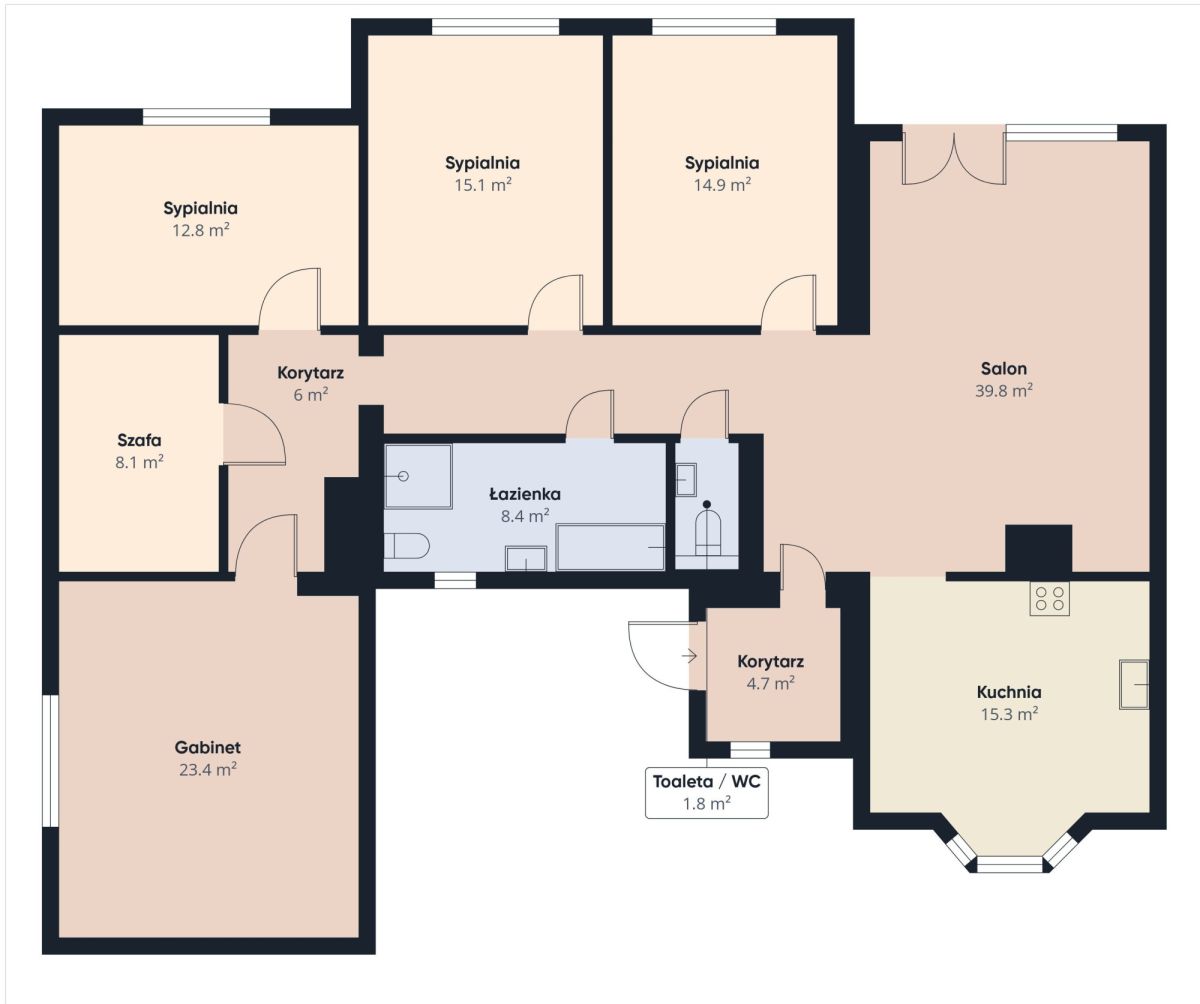 - 4 POKOJE (przybliżone powierzchnie: 15 m², 15 m²,13 m², 23 m²)