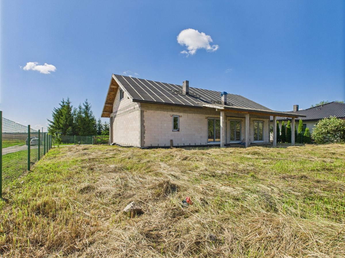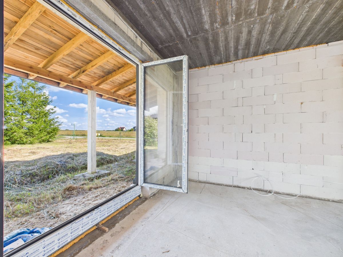 Parter tego domu to gotowa scena do wielkich planów. Salon z podwójnym oknem na taras i ogród - dziś widok na trawę, piach i kretowiska, ale jutro? Zielona dżungla z hamakiem, taras z grillem i miejscem na kawę o poranku. Wystarczy trochę wyobraźni (i betoniarki), żeby z tej „surowej elegancji” zrobić kącik jak z katalogu.