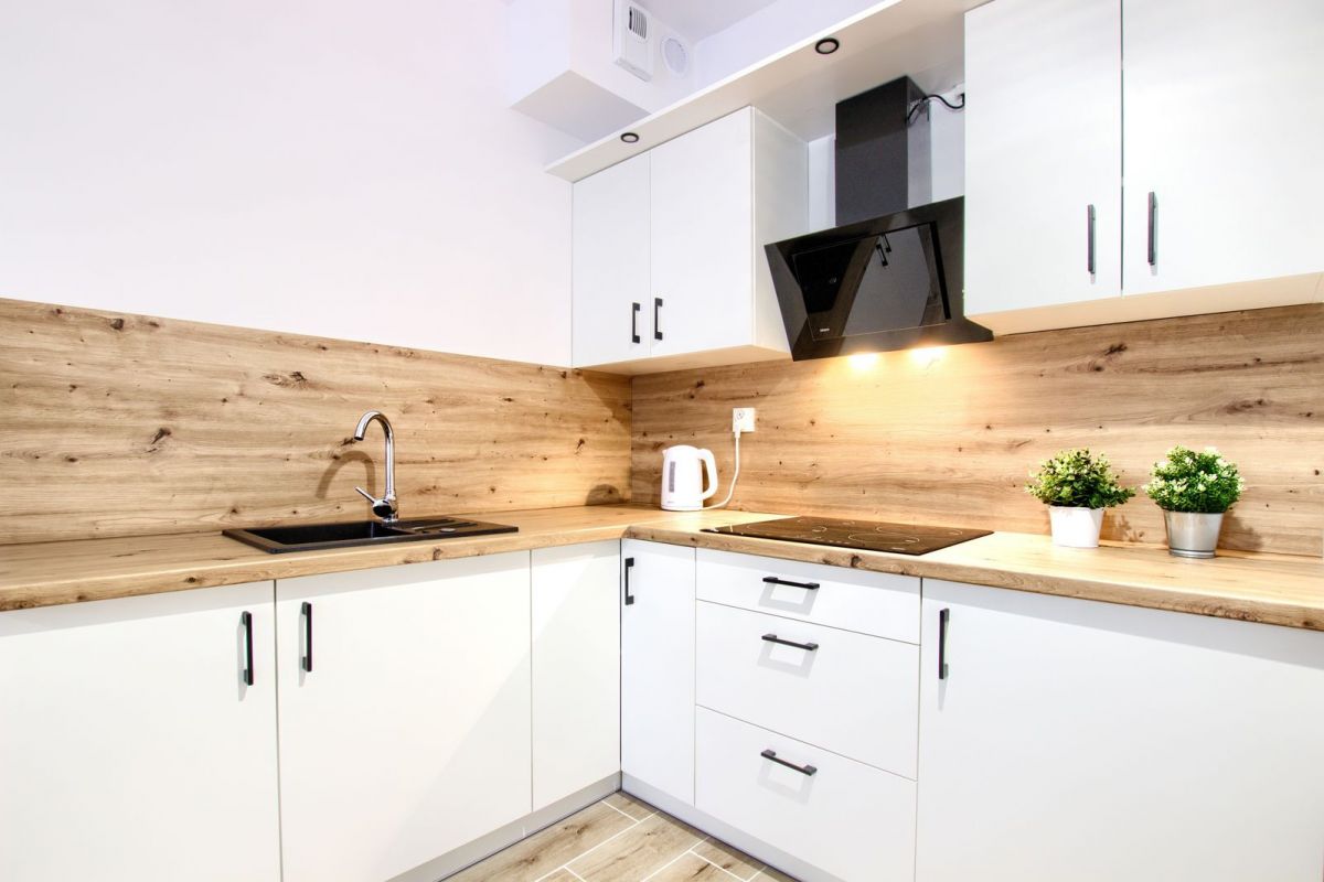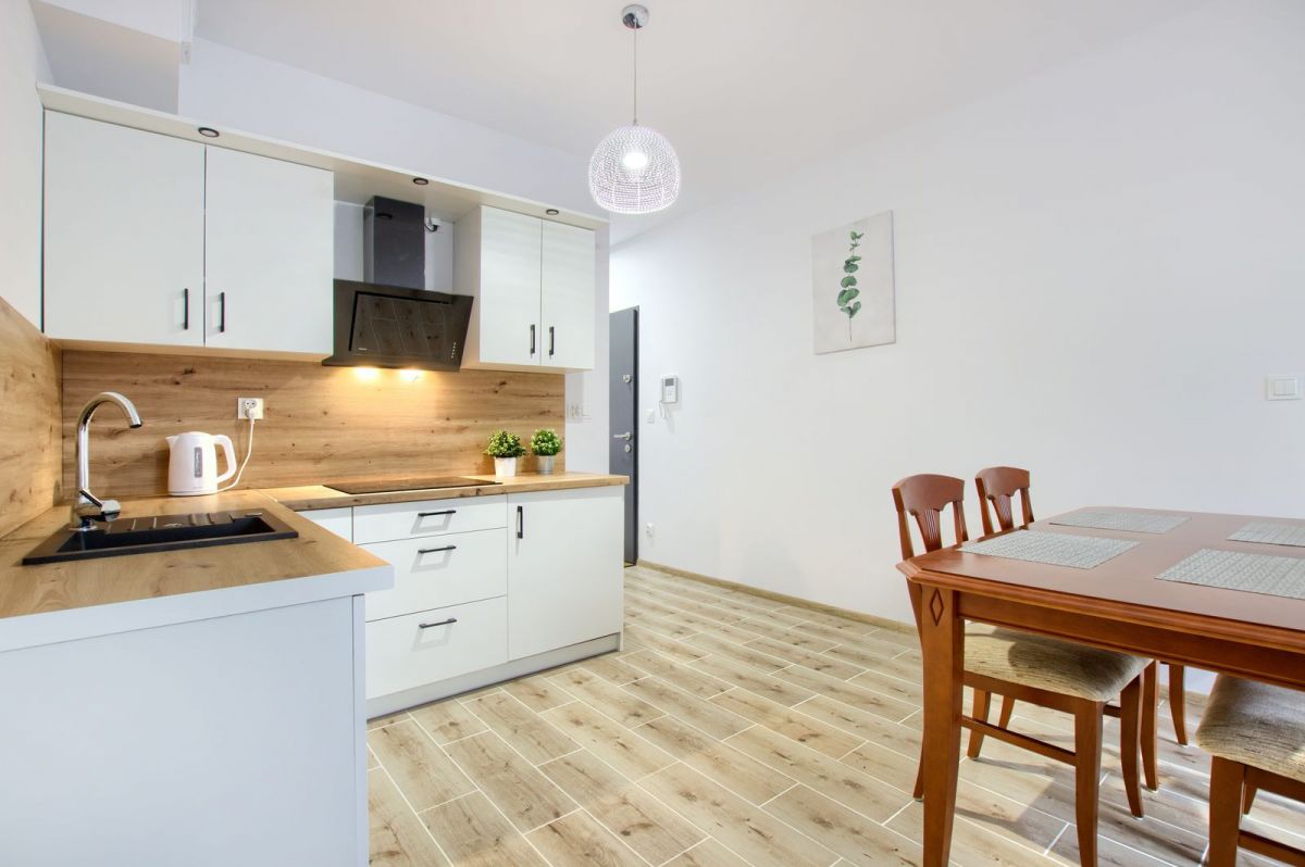 W aneksie kuchennym eleganckie meble, w zabudowie lodówko-zamrażarka, płyta indukcyjna i okap. Wszystkie sprzęty są nowe, na gwarancji.