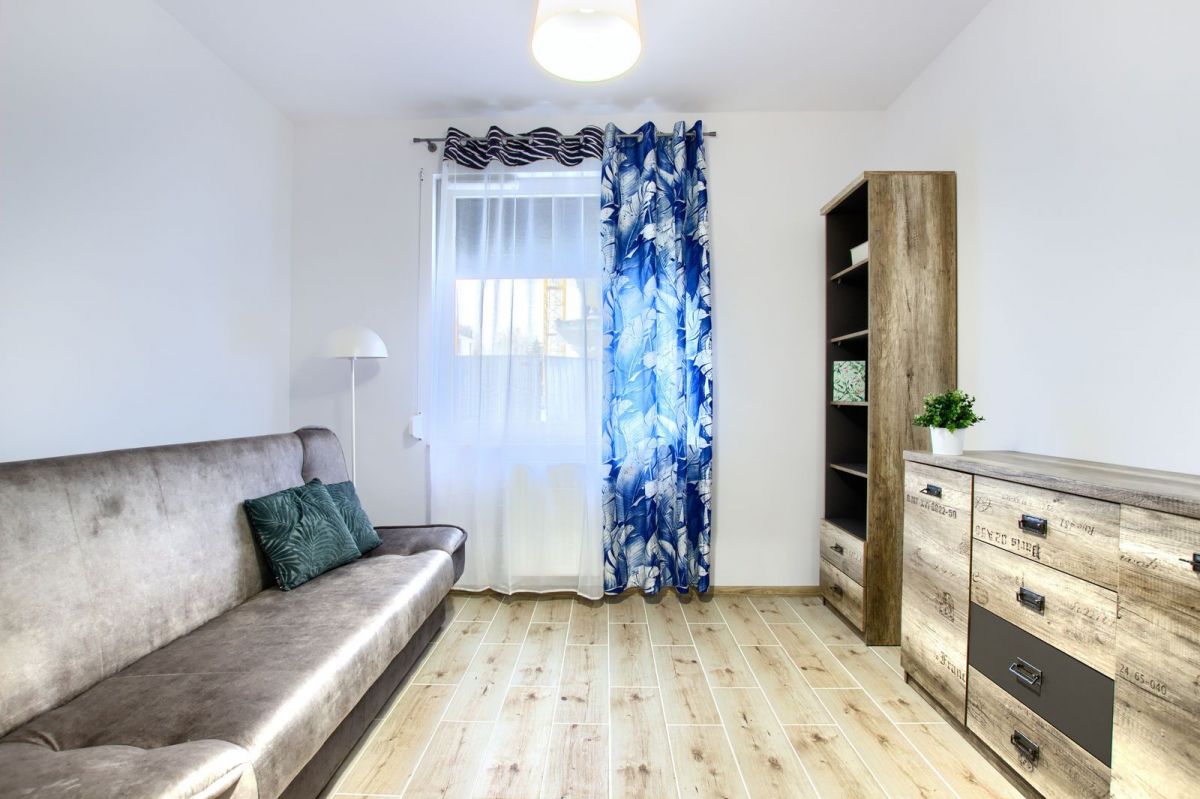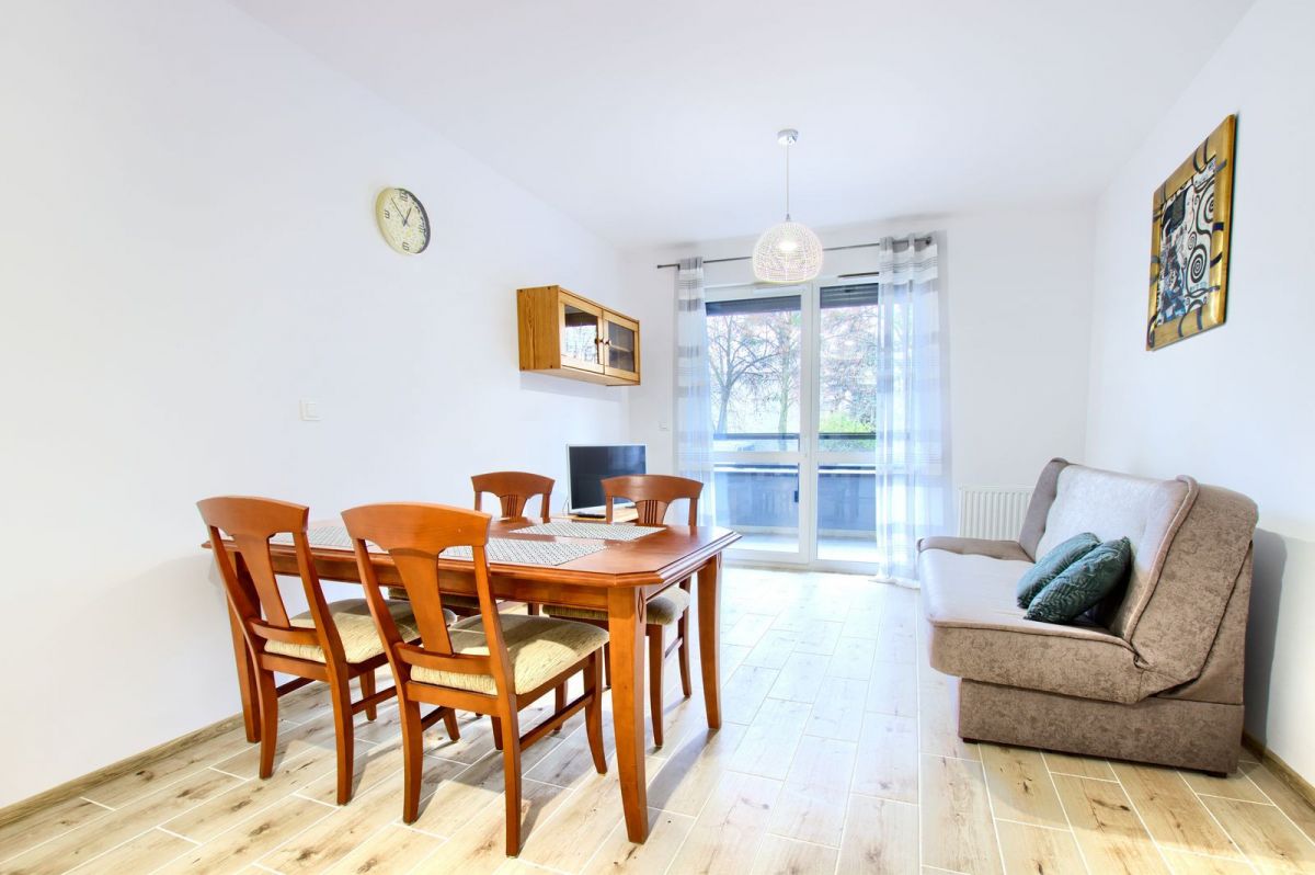 Salon z wyjściem na balkon, wyposażony jest w rozkładaną, wygodną kanapę, stół z czterema krzesłami i komodę z telewizorem.