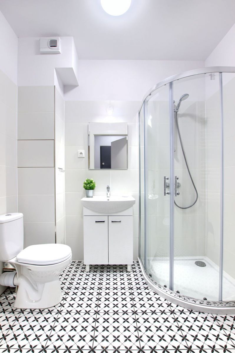 Prysznic z deszczownicą, ubikacja, umywalka z szafką, lustro.