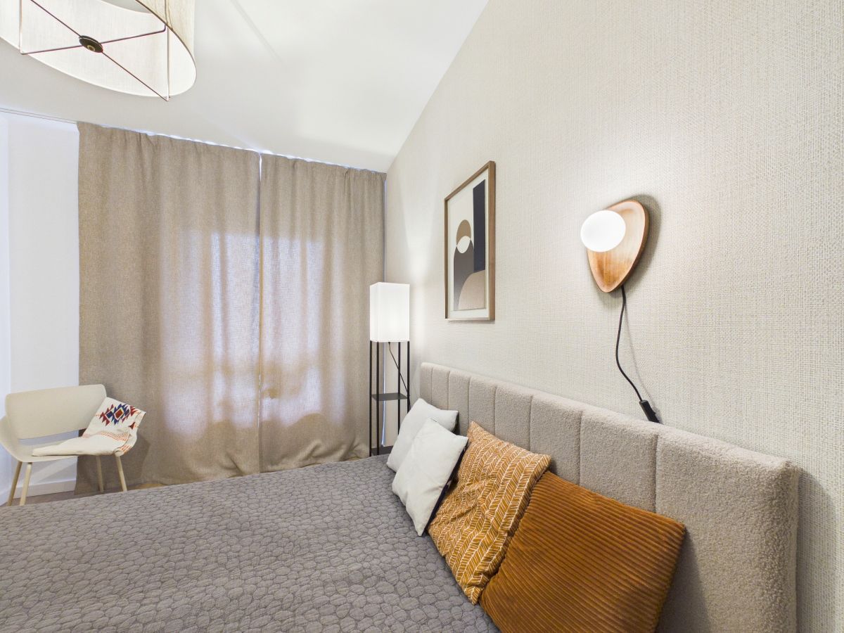 Sypialnia ma powierzchnię ok. 12 m², znajduje się w niej podwójne łóżko i zabudowa, trzydrzwiowa szafa, pełniąca rolę garderoby. Obok łóżka stolik nocny. Na ścianie piękna tapeta imitująca płótno. Nastrój dopełnia idealnie dobrane oświetlenie, piękne lampy oraz dodatki.