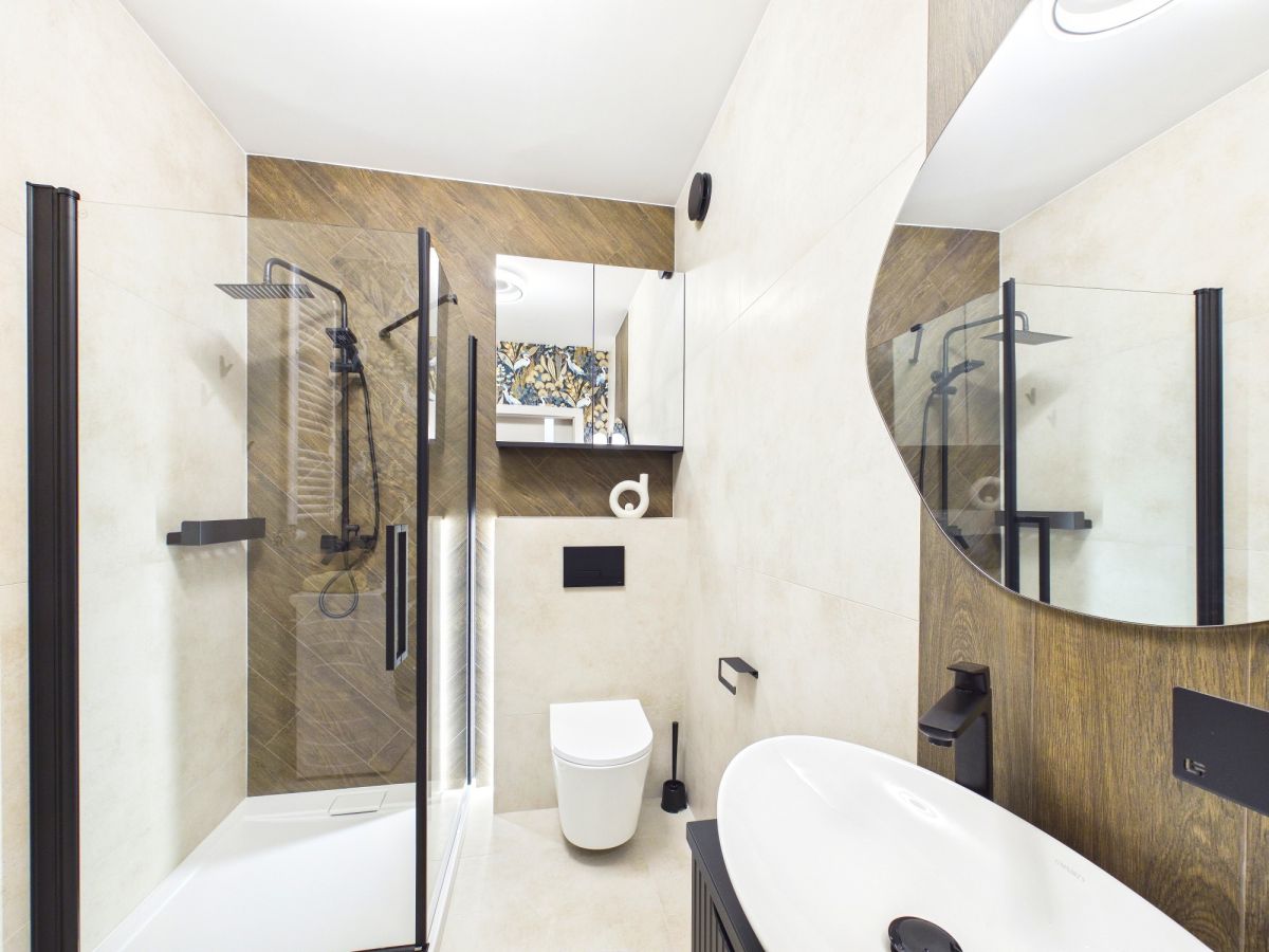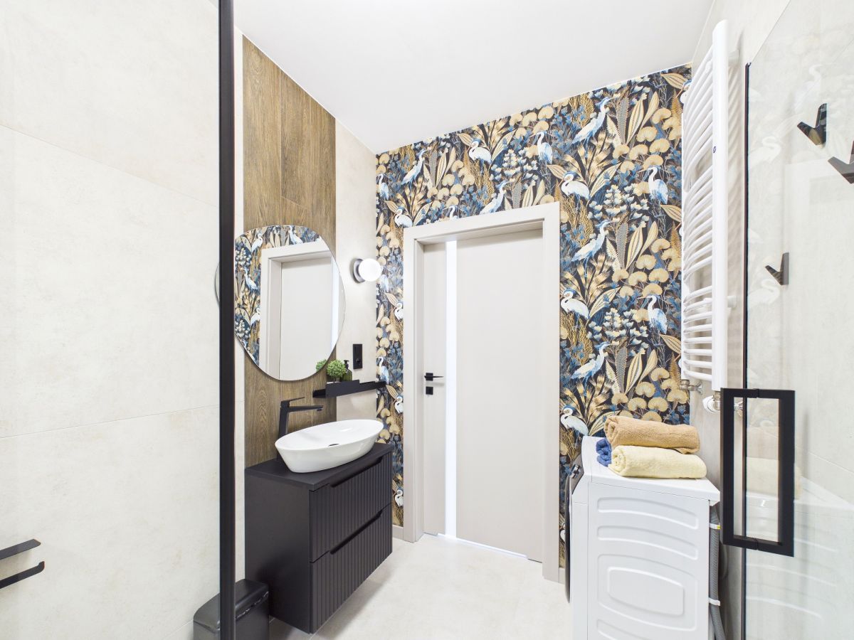 Powierzchnia ok 5 m². Duża kabina prysznicowa, ubikacja, umywalka z szafką, piękne lustro, półeczka, wieszaki oraz pralka.