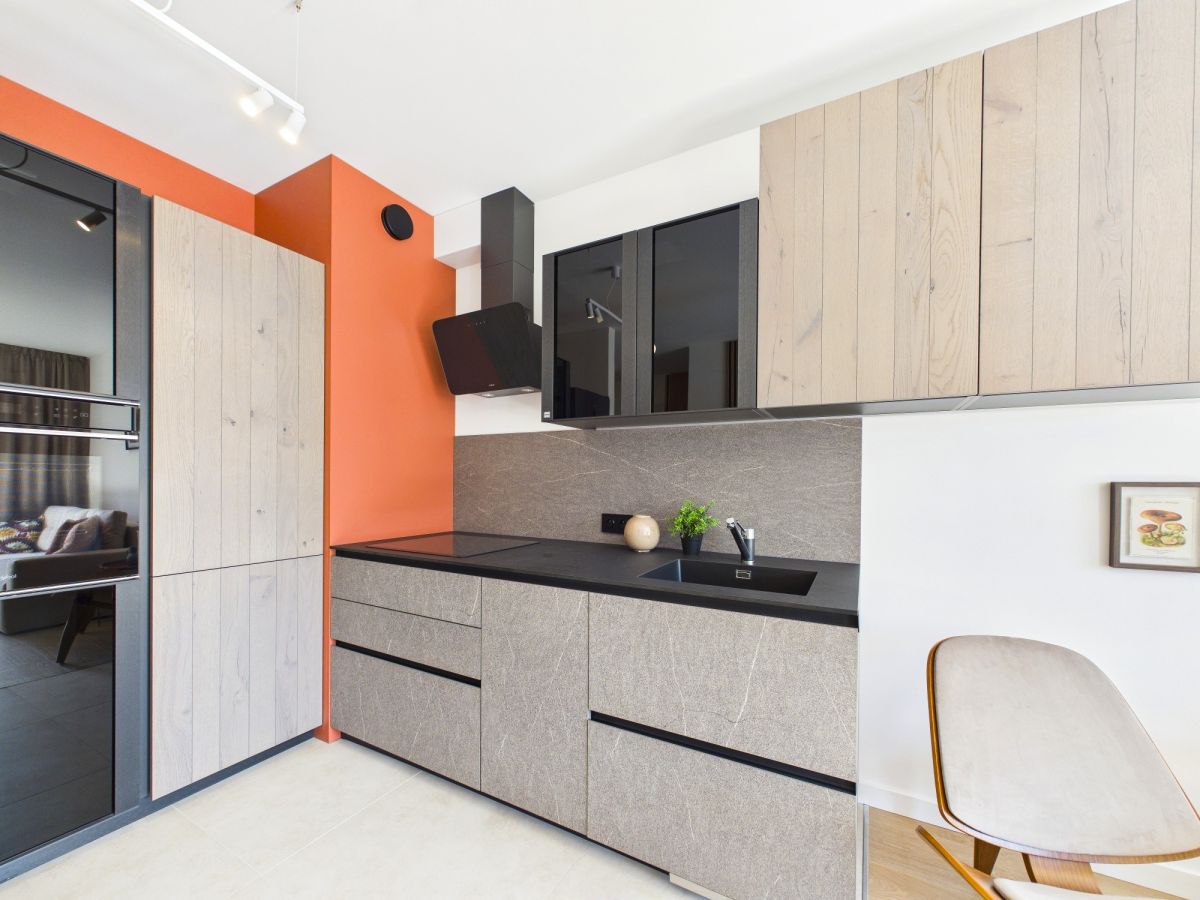 W aneksie, kuchnia włoskiej firmy STOSA z fornirowanymi frontami i blatem HPL, w pełni wyposażona w sprzęty AGD tj.: lodówka, zmywarka czy piekarnik.