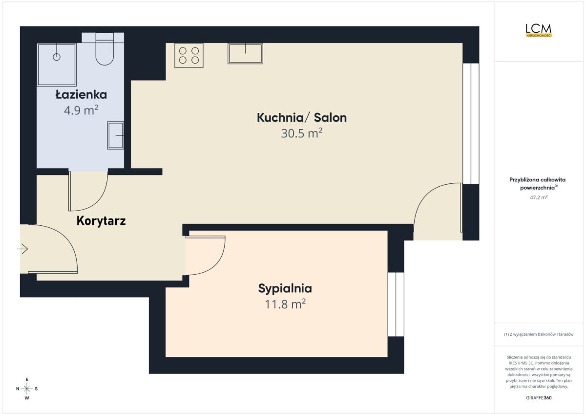 Na powierzchnię ok. 47 m² składa się obszerny salon z aneksem kuchennym, z wyjściem na balkon, sypialnia, łazienka z ubikacją i przedpokój.