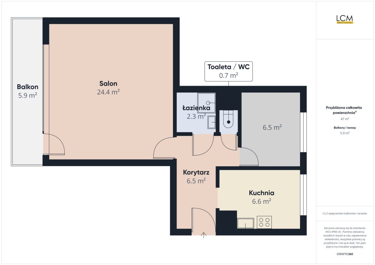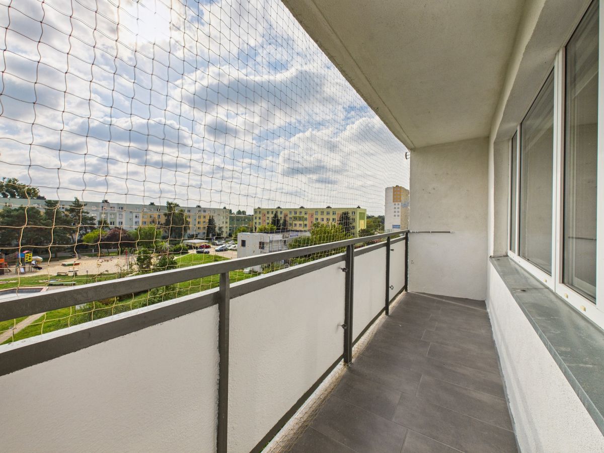 Mieszkanie posiada powierzchnię 48,7 m2. Składa się z salonu 25 m2, sypialni: 6,5 m2, dużej osobnej kuchni: 6,6 m2, przedpokoju, łazienki oraz WC. Z salonu prowadzi wyjście na dużą LOGGIĘ z widokiem na zieleń osiedla.