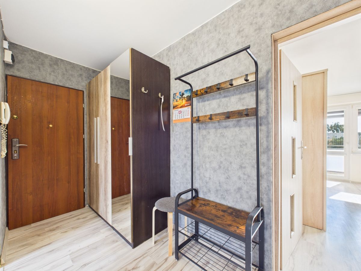 W przedpokoju szafa ubraniowa oraz regał na obuwie i wierzchnią odzież.