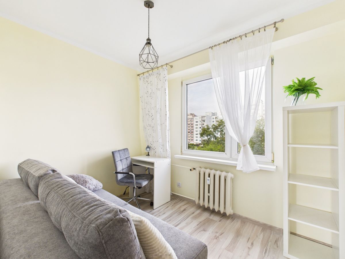 W sypialni rozkładana kanapa szerokości 1.4 m, biurko z krzesłem oraz regał.