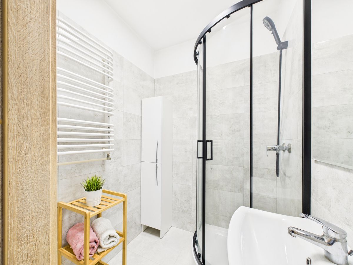 Łazienka z kabiną prysznicową, regałem i wysoką szafką.