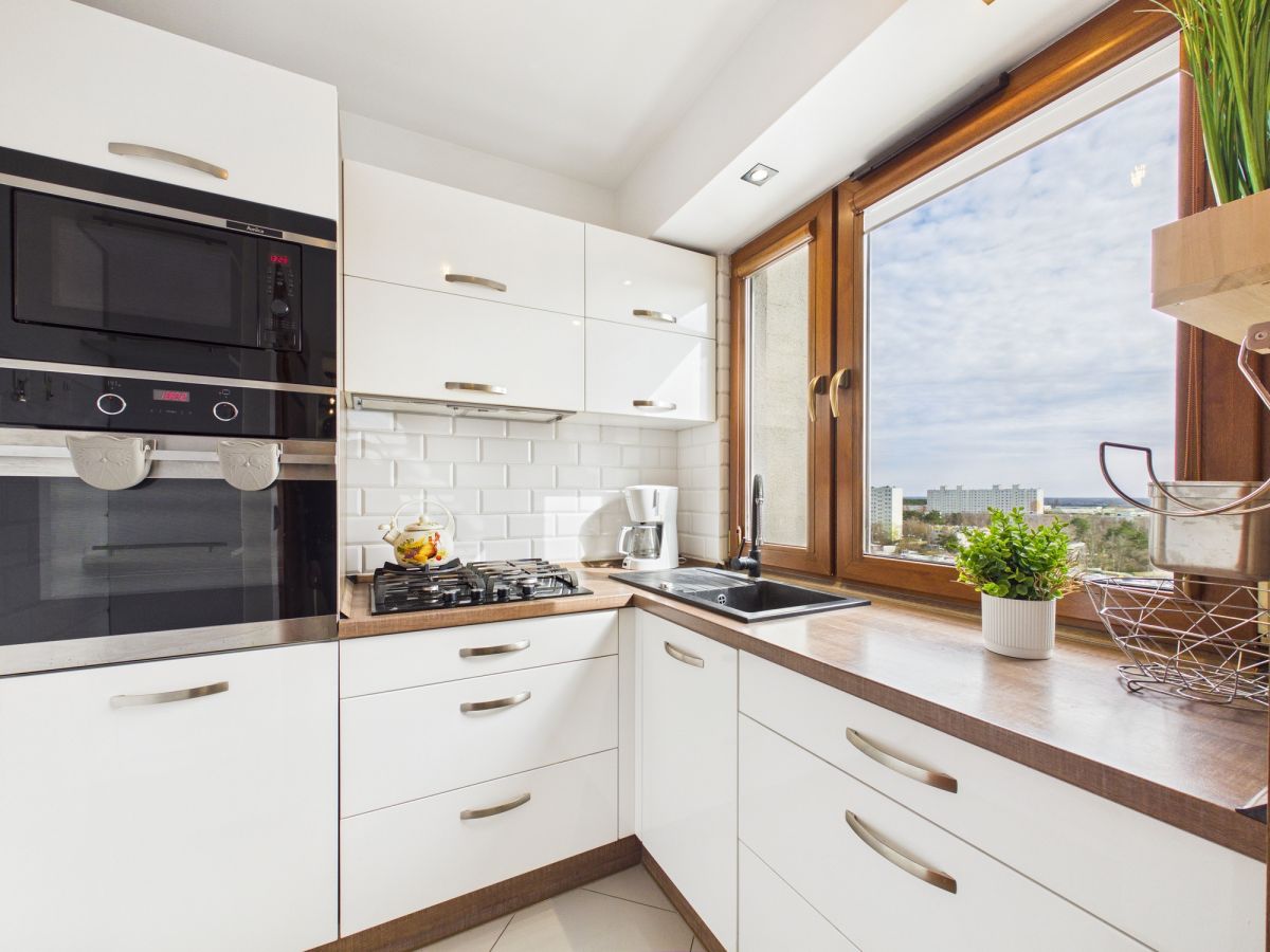 Jasna, mała kuchnia — wszystko pod ręką, bez zbędnego biegania. Półki, półeczki, szuflady, szafki oraz sprzęt AGD: lodówka, piekarnik z płytą gazową, pralka - wszystko mieści się niczym gigabajty na małej karcie sim.