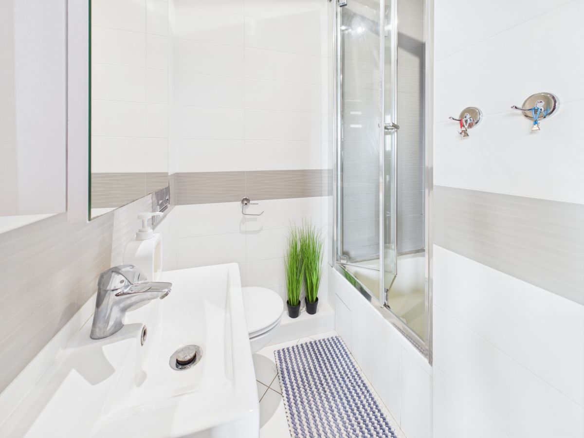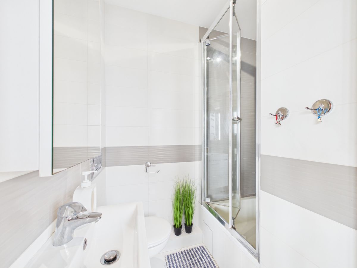 Mała łazienka, z prysznicem, który daje radę - zmieścisz się i jeszcze się odwrócisz.