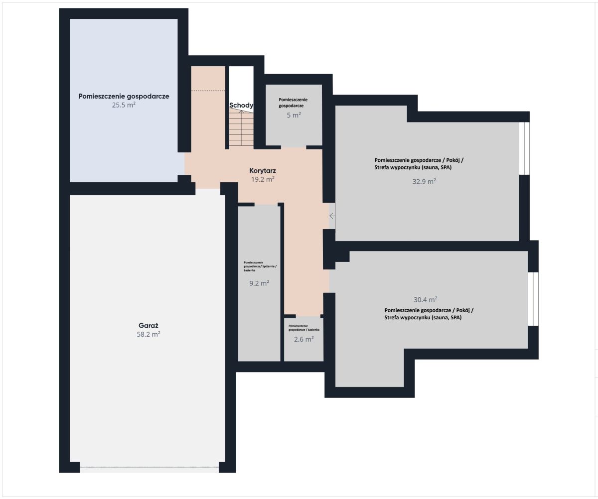 - Piwnica (195 m²): Garaż na 3 pojazdy, strefa relaksu (sauna/jacuzzi), dwa pomieszczenia techniczne/magazyn.