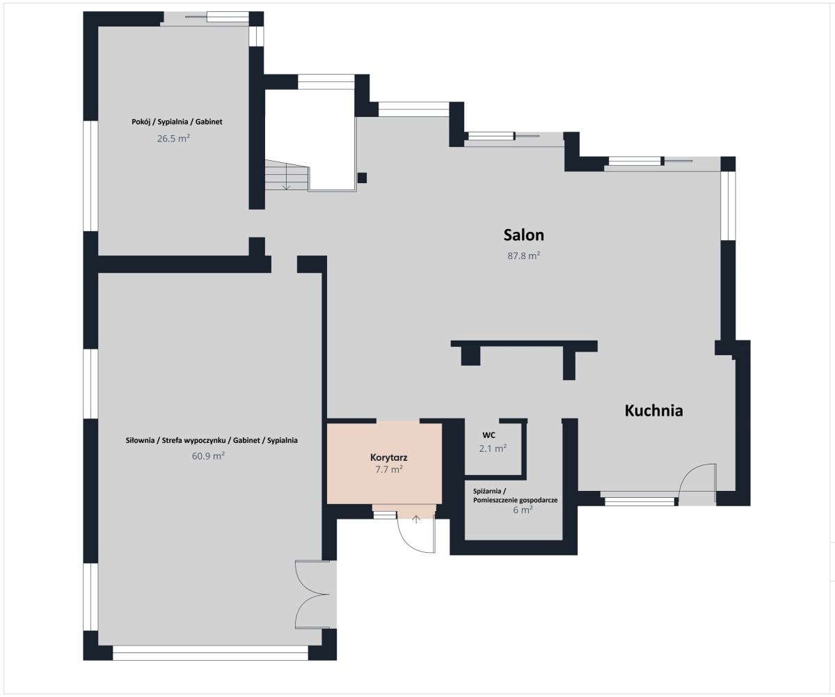 - Parter (190 m²): Przestronna siłownia/fitness (ok. 60 m² ze wzmocnionym stropem), salon z antresolą, kuchnia z jadalnią, gabinet.